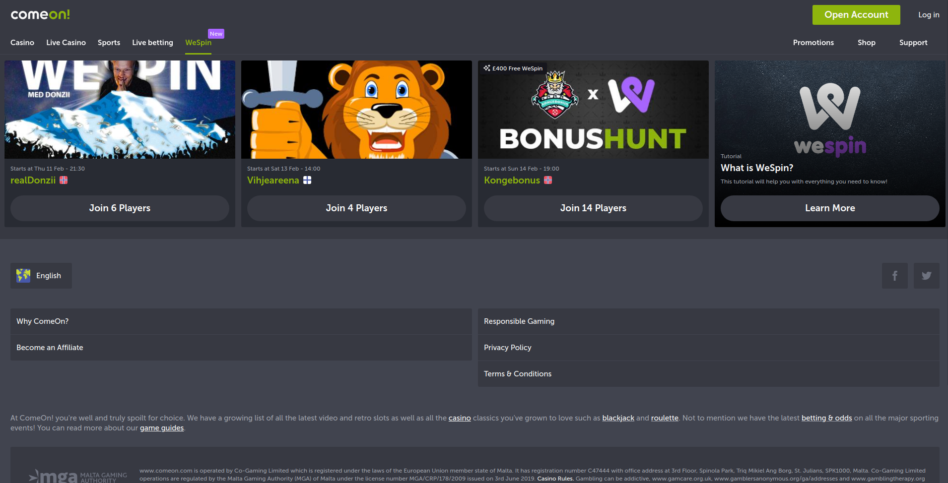 No ComeOn Casino também pode participar em numerosos torneios. Aqui, joga contra outros jogadores para ganhar dinheiro e, ao mesmo tempo, para o prestígio, ficando o mais alto possível na tabela de classificação do ComeOn Casino. Todos os torneios do ComeOn são de acesso gratuito, embora ofereçam a oportunidade de ganhar um milhão de prémios. Fique de olho na agenda de torneios do site, onde poderá encontrar as competições mais adequadas para si.Registo no ComeOn Online Casino
