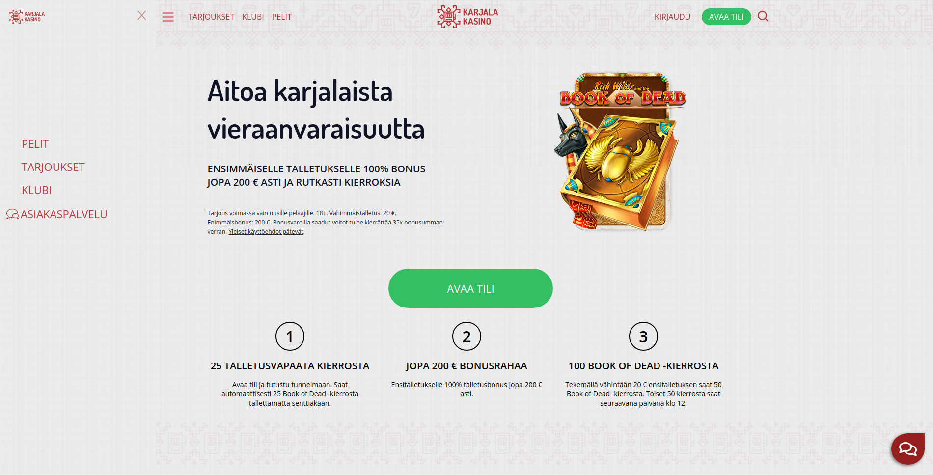 NEW CUSTOMERS. MIN DEPOSIT EUR 20. 40 FREE SPINS ON FIRST DEPOSIT. 160 FREE SPINS AFTER FIRST DEPOSIT (20 PER DAY). MAX WIN EUR100. 20X WAGERING. DEPOSIT BONUS 40X WAGERING. EXPIRES 30 DAYS FROM ISSUE. ELIGIBILITY, GAME, PLATFORM, PAYMENT RESTRICTIONS AND T&CS APPLY.