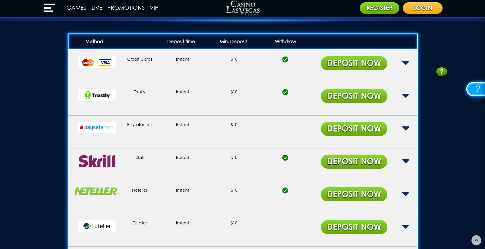 Não existe uma única análise negativa do Casino Las Vegas online, em relação à função de apoio. Isto deve-se ao facto de o terem abrangido de todos os ângulos. Há uma secção de Perguntas Frequentes no site onde pode tentar encontrar as suas próprias respostas a partir das perguntas mais populares que já foram colocadas, ou, caso contrário, pode enviar um email à equipa de apoio ao cliente (o tempo de resposta, neste momento, é de aproximadamente 2 dias). Se precisar de uma resposta mais rápida, existe um chat ao vivo 24 horas por dia, 7 dias por semana, que lhe permite falar com um membro da equipa de apoio ao cliente sobre os seus problemas em qualquer dia e em qualquer altura. É difícil superar este tipo de apoio, e para além disso, pode aceder ao apoio em numerosas línguas diferentes (como listado no início da nossa análise) para facilitar a comunicação, caso o inglês não seja a sua primeira língua.