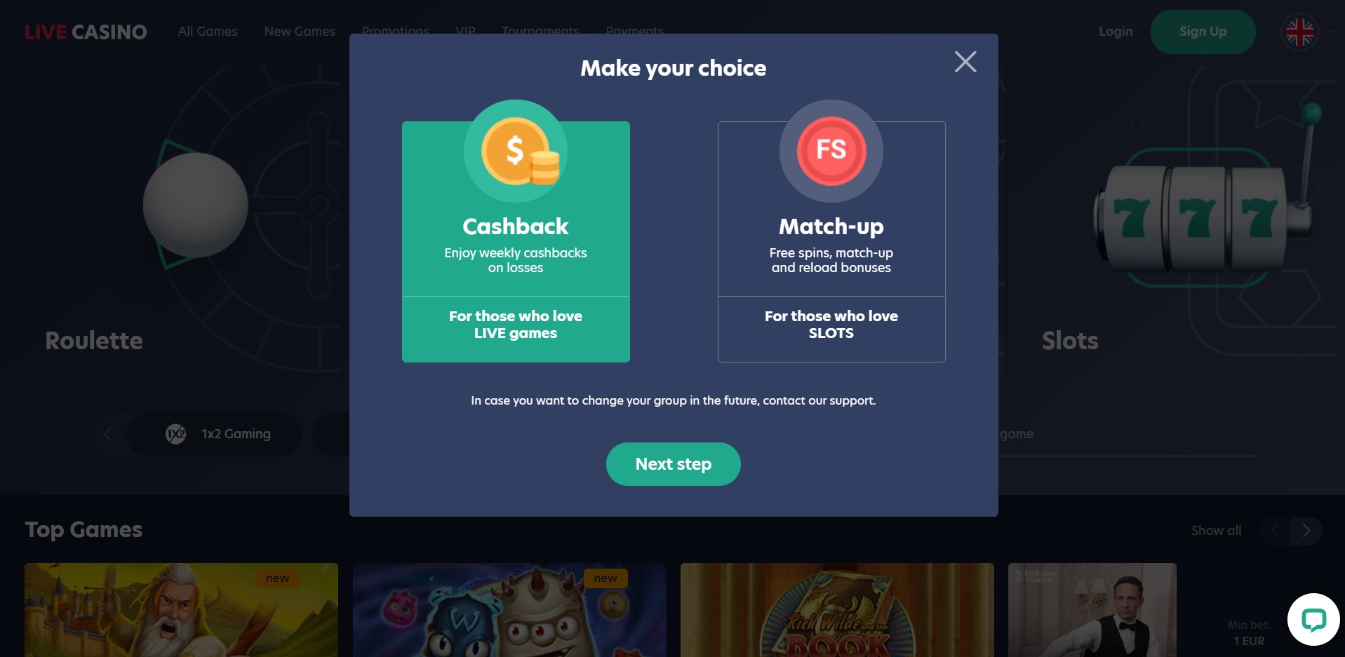 Quanto à linha de bónus Cashback, o casino online Live oferece 20% após o seu primeiro depósito, 25% cashback de segunda-feira e 10% semanalmente (quando o montante perdido for superior a 50 EUR). Para o ativar, o seu primeiro pagamento deve ser superior a 50 EUR. E 50 EUR é também o máximo que pode obter. Os apostadores possuem 1 dia para utilizar o presente.