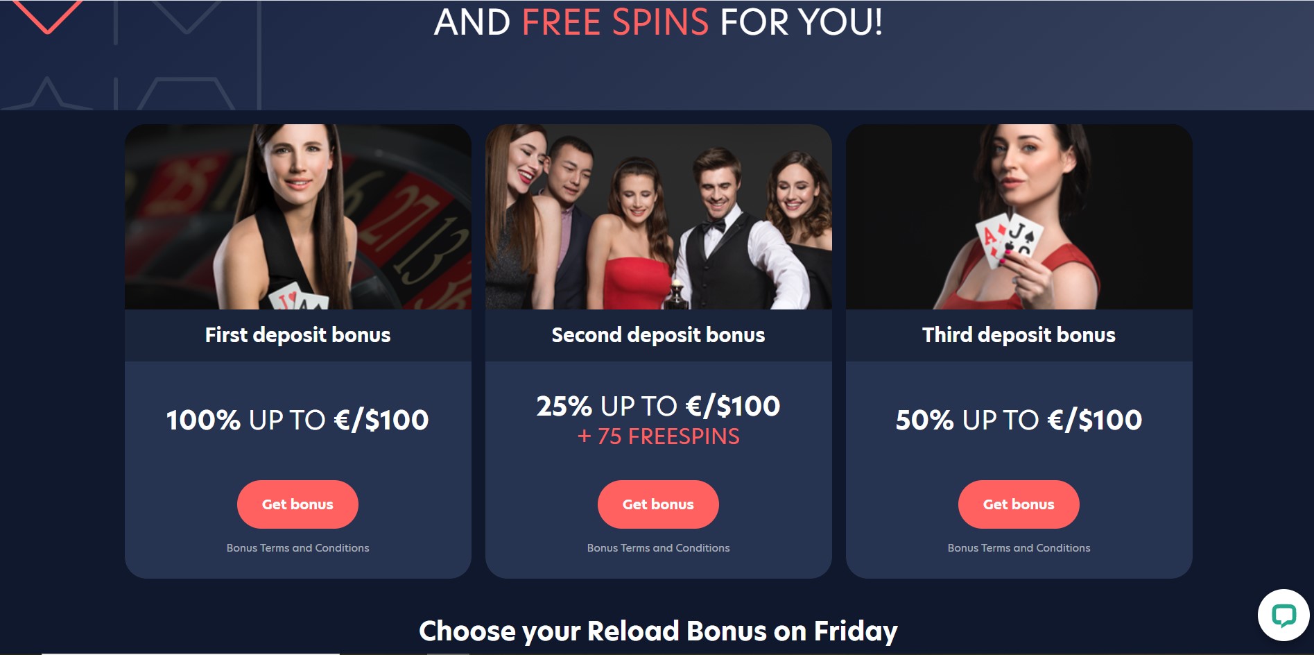 Quando se trata da segunda parte (Match up), recebe 100% (até 100 EUR) para o primeiro pagamento. O segundo e o terceiro depósitos também trazem vantagens adicionais - 25% + 75 FS (25 por dia) e 50%. Ambos os valores são novamente até 100 EUR. A aposta é de x40. Friday Reload é outro recurso que o segundo presente de boas vindas pode oferecer.