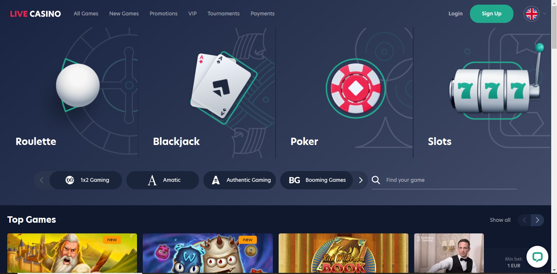 Aprendeu um pouco sobre promoções? Ótimo. Agora é altura de se familiarizar com as slots do Live Casino. É de facto uma área agradável, uma vez que pode encontrar em todo o site projetos posicionados estrategicamente na linha da frente. Desta forma, não surpreende que a 1x2 Gaming, Betsoft Gaming, Booming Games e outros gigantes forneçam o software existente no site.