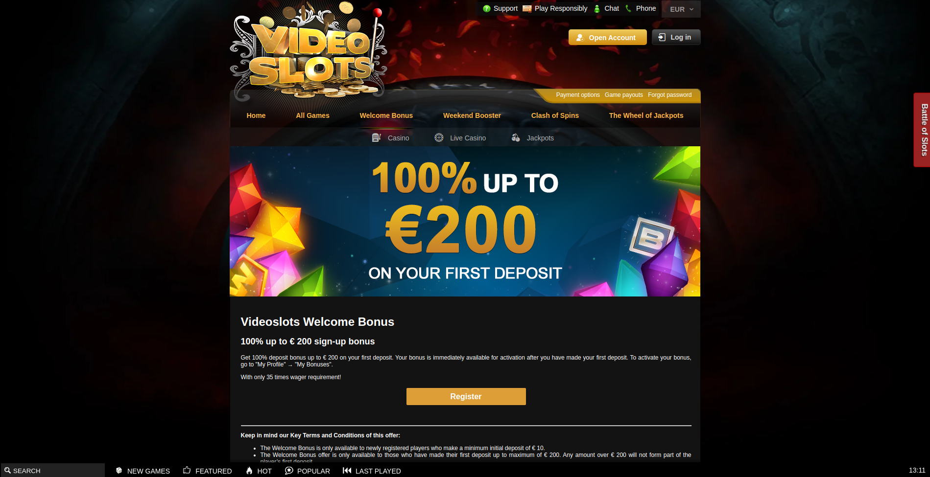 Min. Deposit: €20. Max. Bonus: €200. In order to withdraw your winnings, you must wager at least x35 your bonus amount (minimum wagering requirement).